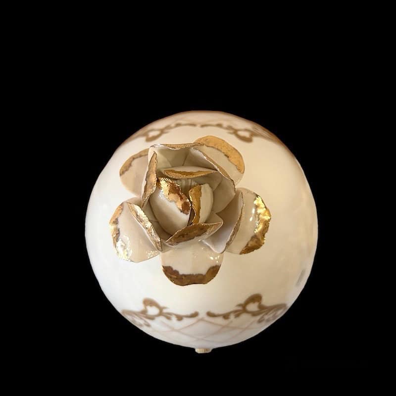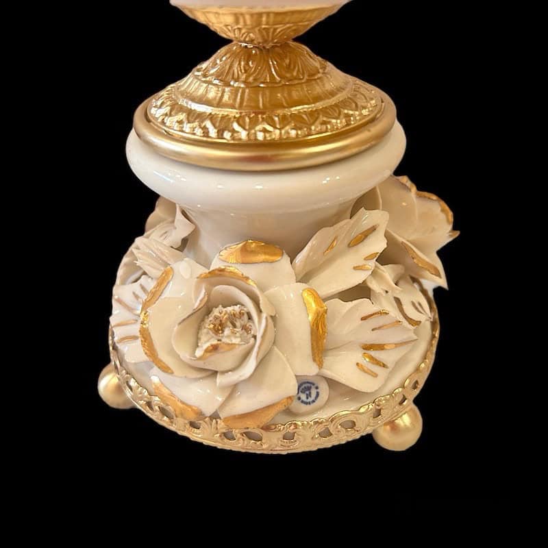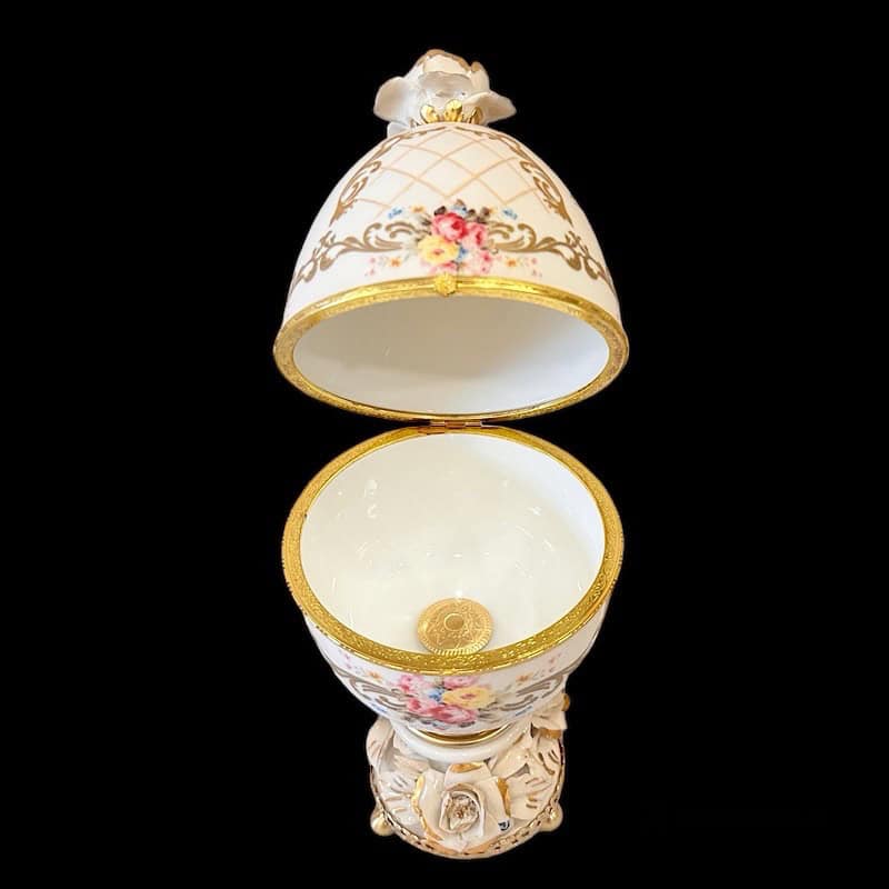 Κουτί σε αυγοειδές σχήμα με κούμπωμα, από ιταλική ιβουαρ πορσελάνη, διακοσμημένη με ρομαντικά ροζ και κίτρινα λουλουδάκια, πλαισιωμένα με χρυσό μοτίβο. Η βάση και η κορυφή είναι στολισμένα με τριανταφυλλάκια capodimonte ολοκληρώνοντας αυτό το υπέροχο κομμάτι!