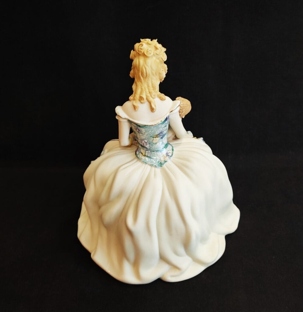 Φιγούρα κυρίας του 1700 που κρατάει το μωρό της. Στο φόρεμα της αναπαριστά την εποχή εκείνη, φουσκωτό με έντονες πτυχώσεις, σε γαλάζιες αποχρώσεις.