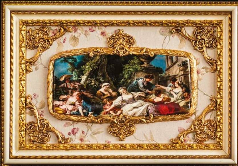 Κλασικό κάδρο με ρομαντικό ζευγάρι εποχής. Η παράσταση που απεικονίζεται επάνω σε πλάκα πορσελάνης, περικλείεται από χρυσό κορδόνι και προσαρμόζεται επάνω σε επιφάνεια με floral ύφασμα και επιχρυσωμένες λεπτομέρειες. Η χρυσαφί κορνίζα πλαισιώνει αυτό το υπέροχο κλασικό κομμάτι.