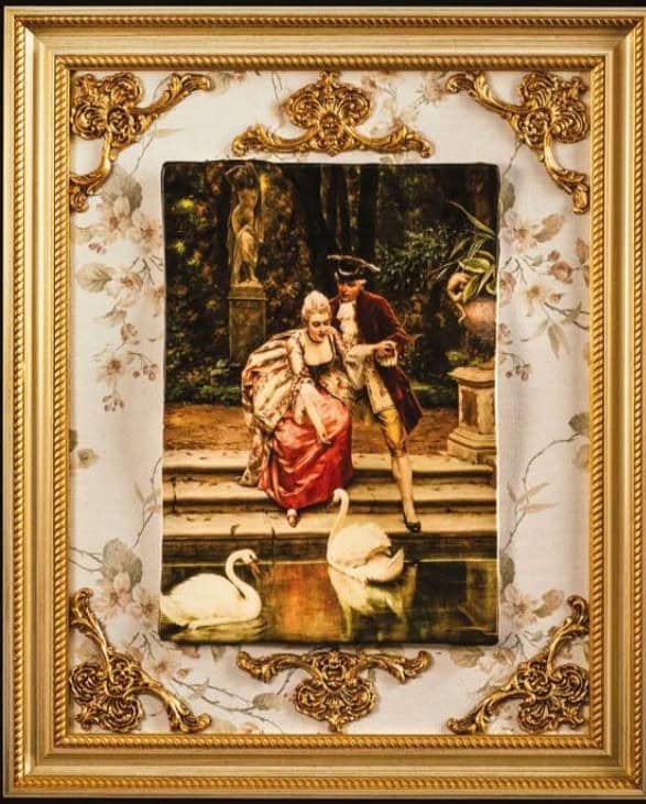 Κλασικό κάδρο με ρομαντικό ζευγάρι εποχής. Η παράσταση που απεικονίζεται επάνω σε πλάκα πορσελάνης, προσαρμόζεται επάνω σε επιφάνεια με floral ύφασμα και επιχρυσωμένες λεπτομέρειες. Η χρυσαφί κορνίζα πλαισιώνει αυτό το υπέροχο κλασικό κομμάτι.