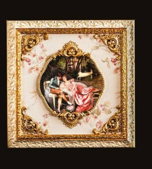 Κλασικό κάδρο με ρομαντικό ζευγάρι εποχής. Η παράσταση που απεικονίζεται επάνω σε πλάκα πορσελάνης, περικλείεται από χρυσό κορδόνι και προσαρμόζεται επάνω σε επιφάνεια με floral ύφασμα και επιχρυσωμένες λεπτομέρειες. Η χρυσαφί-ντεκαπέ κορνίζα πλαισιώνει αυτό το υπέροχο κλασικό κομμάτι.