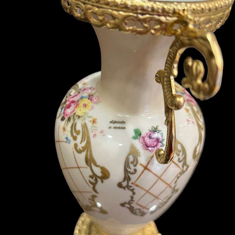 Βάζο σε στυλ αμφορέα κλασικό από ιταλική πορσελάνη, διακοσμημένο με ρομαντικά ροζ και κίτρινα λουλουδάκια πλαισιωμένα με χρυσό μοτίβο. Διαθέτει επίχρυσα χερούλια και περίτεχνη βάση από ορύχαλκο 24Κ.