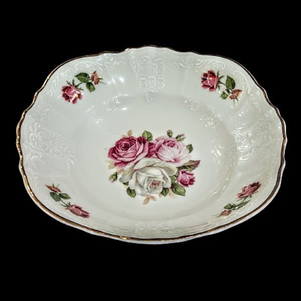 Σαλατιέρα ανάγλυφης πορσελάνης Bernadotte Τσεχίας, σε ιβουάρ χρώμα, διακοσμημένο με ρομαντικά ροζ- λευκά τριαντάφυλλα και μια φίνα ρίγα χρυσού στο χείλος.
