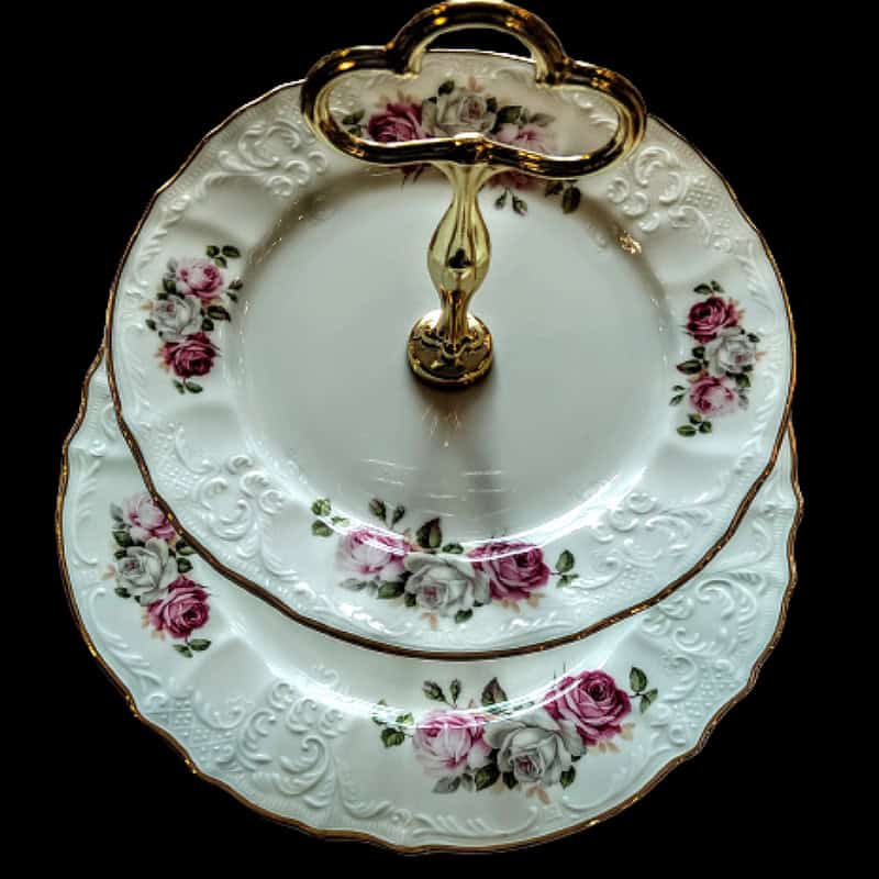 Εταζέρα διώροφη ανάγλυφης πορσελάνης bernadotte, της τσέχικης εταιρίας Thun, σε ιβουάρ χρώμα διακοσμημένη με ρομαντικά ροζ- λευκά τριαντάφυλλα. Κατάλληλη για τα γλυκά και κεράσματά σας.