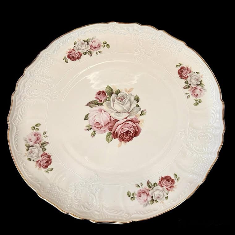 Τουρτιέρα ανάγλυφης πορσελάνης Bernadotte, της τσέχικης εταιρίας Thun, σε ιβουάρ χρώμα, διακοσμημένη με ρομαντικά ροζ- λευκά τριαντάφυλλα.