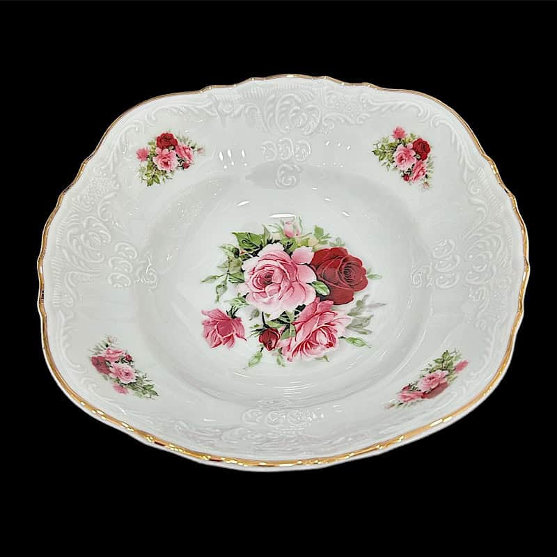 Σαλατιέρα ανάγλυφης πορσελάνης Bernadotte, της τσέχικης εταιρίας Thun, σε λευκό χρώμα, διακοσμημένη με ρομαντικά ροζ-μπορντό τριαντάφυλλα. Ιδανική για σαλάτες και για τα κεράσματά σας!