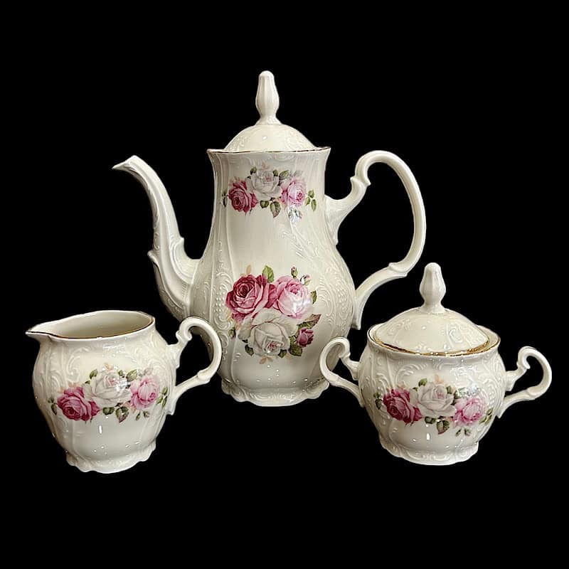 Γαρνιτούρα που αποτελείτε από τσαγιέρα, ζαχαριέρα, γαλατιέρα, ανάγλυφης πορσελάνης Bernadotte, της τσέχικης εταιρίας Thun, σε ιβουάρ χρώμα, διακοσμημένη με ρομαντικά ροζ-λευκά τριαντάφυλλα. Μπορείτε να συμπληρώσετε με τα αντίστοιχα φλυτζάνια τσαγιού!