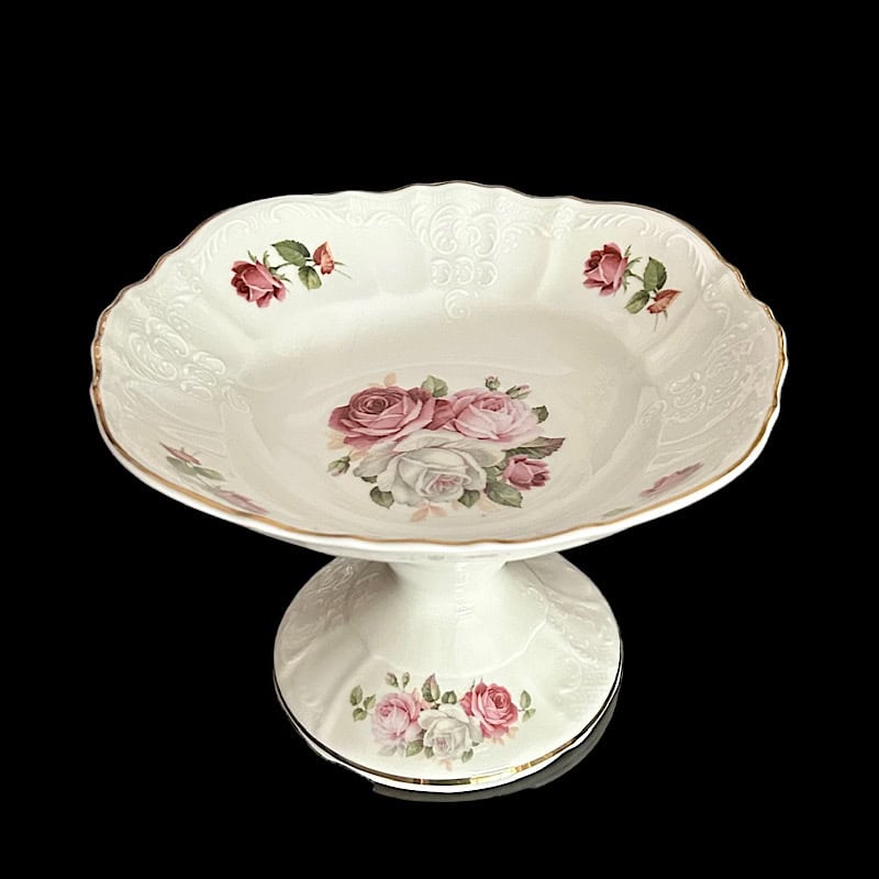 Φρουτιέρα ανάγλυφης πορσελάνης bernadotte, της τσέχικης εταιρίας Thun, σε ιβουάρ χρώμα διακοσμημένη με ρομαντικά ροζ- λευκά τριαντάφυλλα.