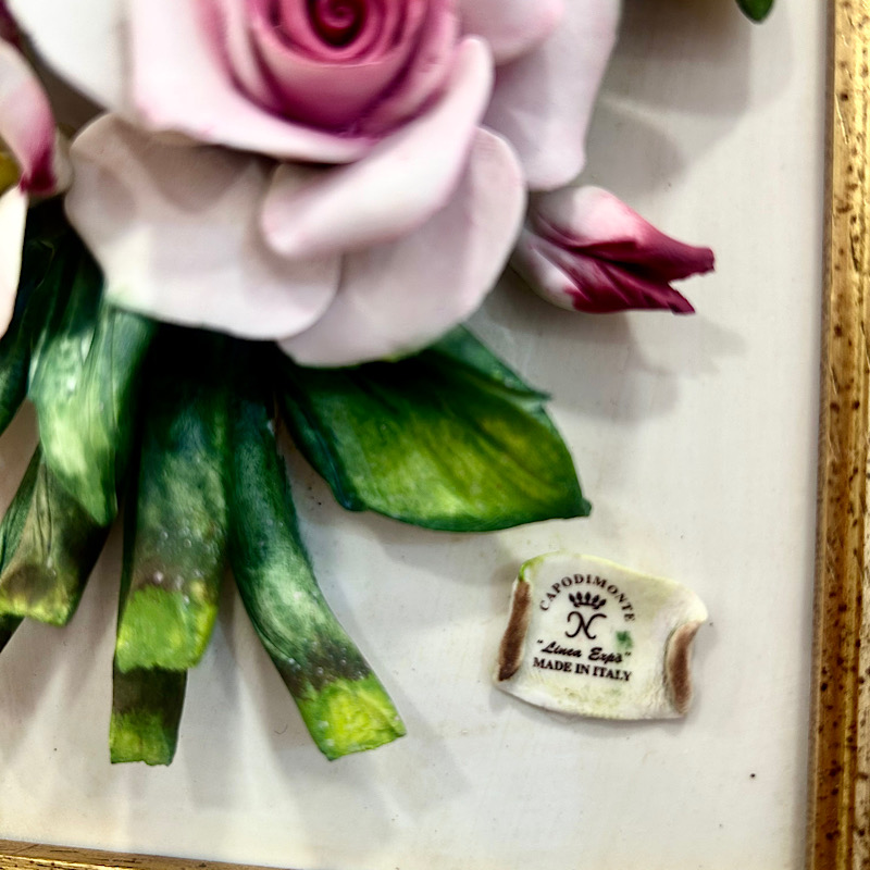 Η σύνθεση παρουσιάζει μία εντυπωσιακή ανάγλυφη πορσελάνινη ανθοδέσμη με τριαντάφυλλα και μικρά ανθάκια σε παστέλ αποχρώσεις. Η χρυσή κλασική κορνίζα , πλαισιώνει ιδανικά το έργο, ενισχύοντας την συλλεκτική του αξία.