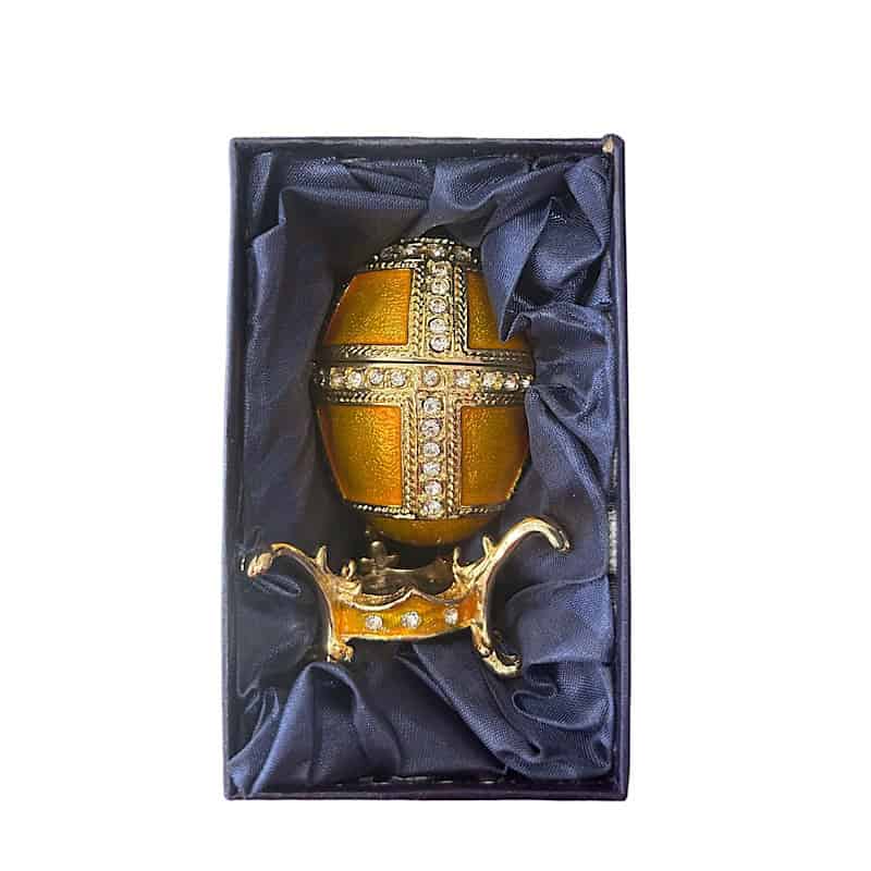 Αυγό τύπου fabergé κίτρινο, επενδεδυμένο με σμάλτο και διακοσμημένο με τεχνητές πέτρες αποτελεί ένα κομψοτέχνημα. Ανοίγει στη μέση και φέρει συσκευασία δώρου.