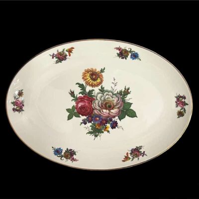 Πιατέλα οβαλ από πορσελάνη Βαυαρίας, διακοσμημένη με πολύχρωμα αγριολούλουδα και ρίγα χρυσού 22Κ στο χείλος. Κατάλληλη για σερβίρισμα. Προσαρμόζοντας ελατήριο στην πίσω πλευρά, μπορεί να γίνει διακοσμητική για τοίχο.