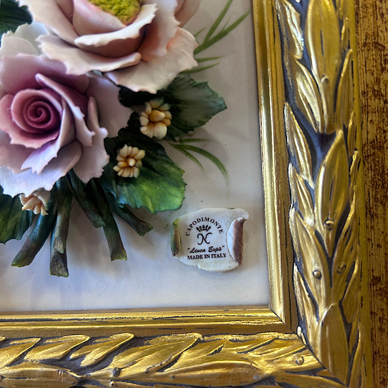 Η σύνθεση παρουσιάζει ανάγλυφα πορσελάνινα μικρά ανθάκια σε παστέλ αποχρώσεις. Η χρυσή κλασική κορνίζα, πλαισιώνει ιδανικά το έργο, ενισχύοντας την συλλεκτική του αξία.