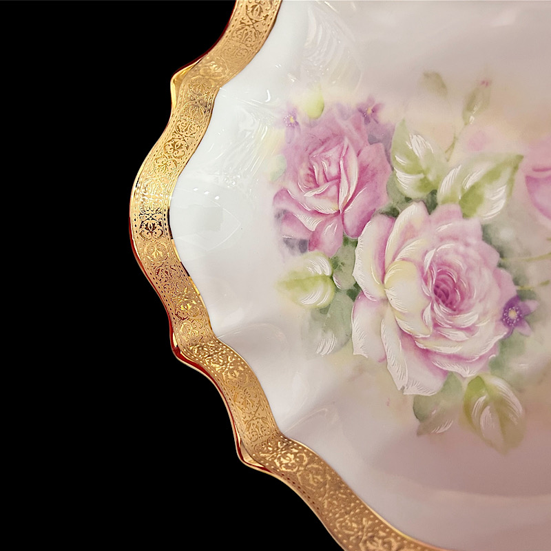 Μπολ πορσελάνης Limoges, σε οβάλ σχήμα, διακοσμημένο με ρομαντικό μπουκέτο ροζ τριαντάφυλλα. Περιμετρικά, στο κυματιστό τελείωμα, η μπορντούρα χρυσού 22Κ προσθέτει λάμψη και αρχοντιά!
