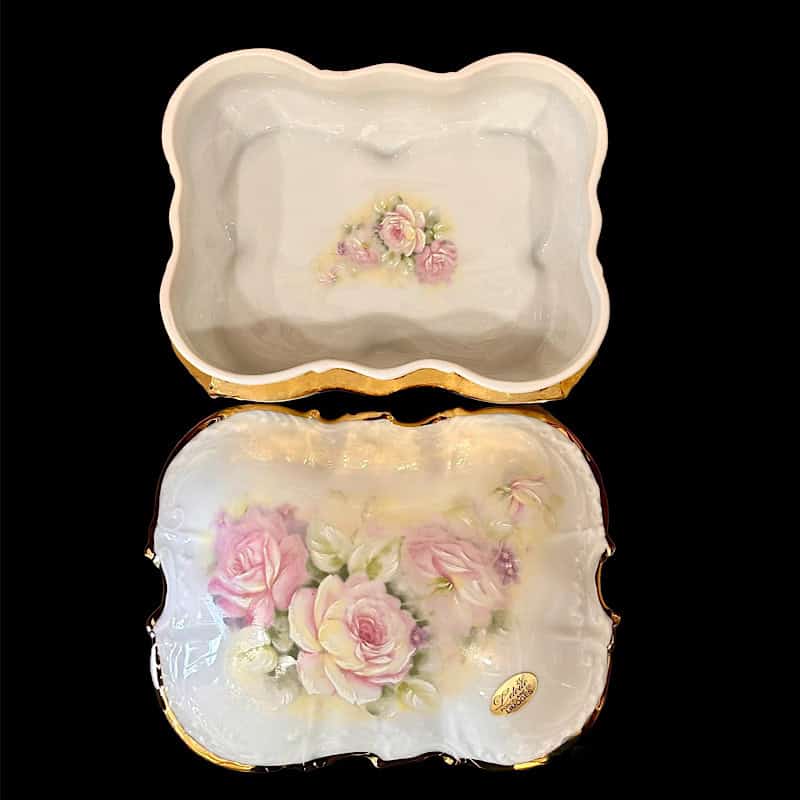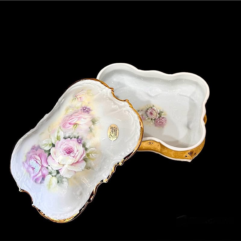 Φοντανιέρα πορσελάνης Limoges, σε παραλληλόγραμο σχήμα, διακοσμημένη με ρομαντικό μπουκέτο ροζ τριαντάφυλλα. Περιμετρικά υπάρχει μπορντούρα χρυσού που προσθέτει λάμψη και αρχοντιά! Ιδανικό για κοσμήματα αλλά και σοκολατάκια.