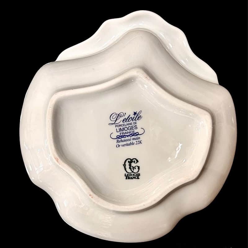 Μπολάκι πορσελάνης Limoges, σε σχήμα κοχυλιού, διακοσμημένο με ρομαντικό μπουκέτο ροζ τριαντάφυλλα.