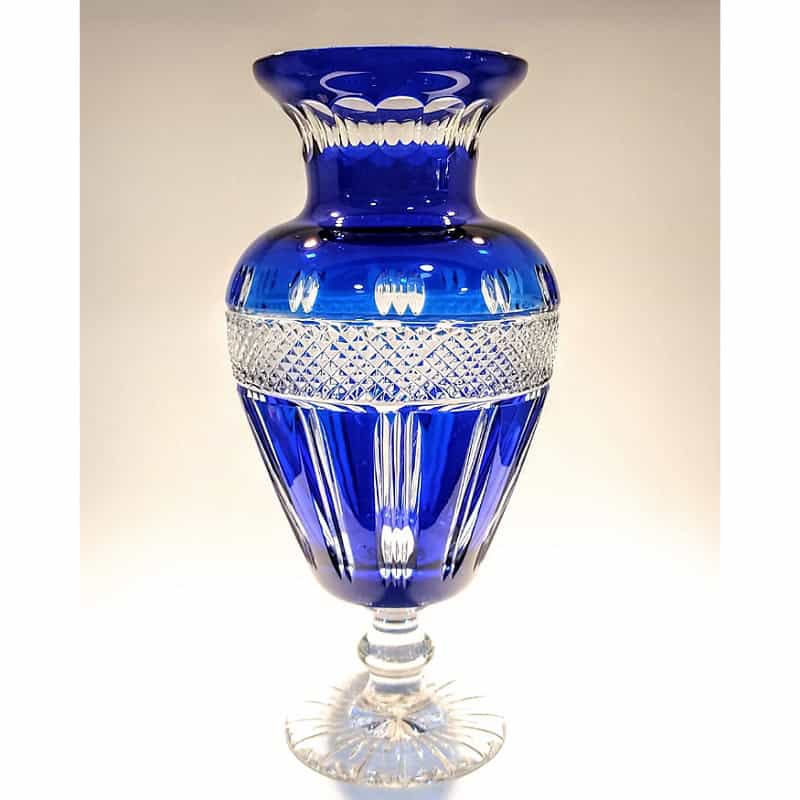 Κρυστάλλινο βάζο με “πόδι”,σε λαμπερό cobalt blue χρώμα και ιδιαίτερο σκάλισμα. Φτιαγμένο από υψηλής ποιότητας χειροποίητο κρύσταλλο 24%Pbo. Ιδανικό δώρο για συλλέκτες χρωματιστών κρυστάλλων.