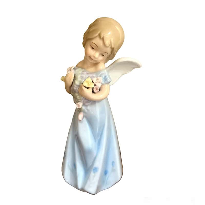 Αγγελάκι πορσελάνης με γαλάζιο φόρεμα που κρατάει λουλούδια.