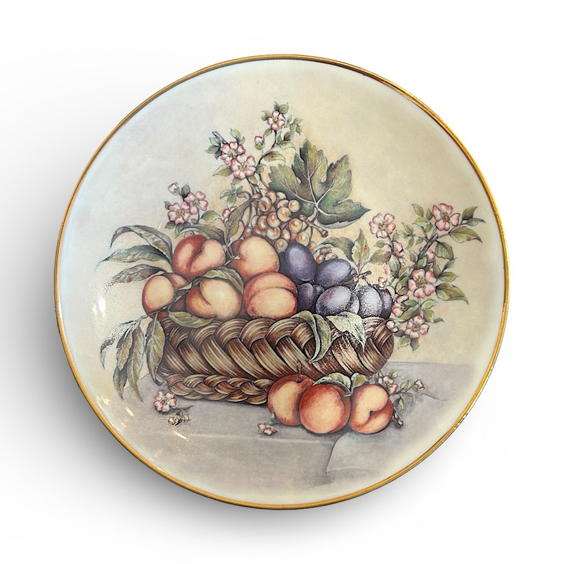 Πιάτο τοίχου με απεικόνιση καλάθι με φρούτα του Grazia Norton. Το μοτίβο σε αυτά τα πιάτα καλύπτει ολόκληρη την επιφάνεια – μια λεπτή χρυσή ρίγα 24 καρατίων δίνει την τελική πινελιά.