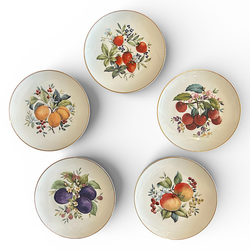 Σετ 5 τμχ. πιάτα τοίχου με απεικόνιση διάφορα φρούτα με “ζωντανά” χρώματα σε λευκό φόντο και λεπτή χρυσή ρίγα στο τελείωμα. Υπέροχη συλλογή που «ντύνει» έναν τοίχο κουζίνας!