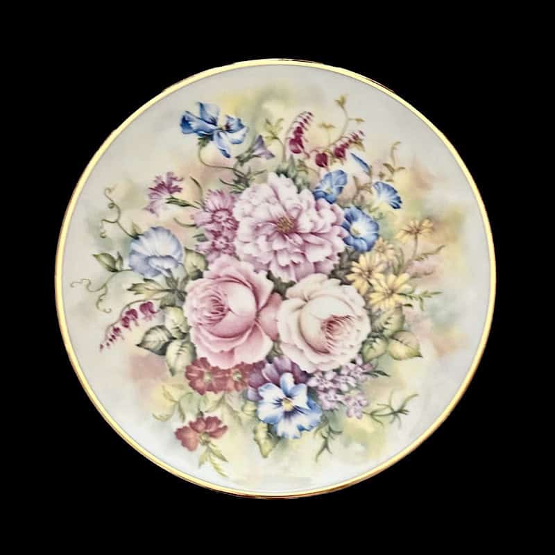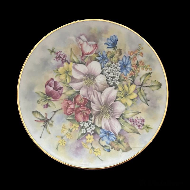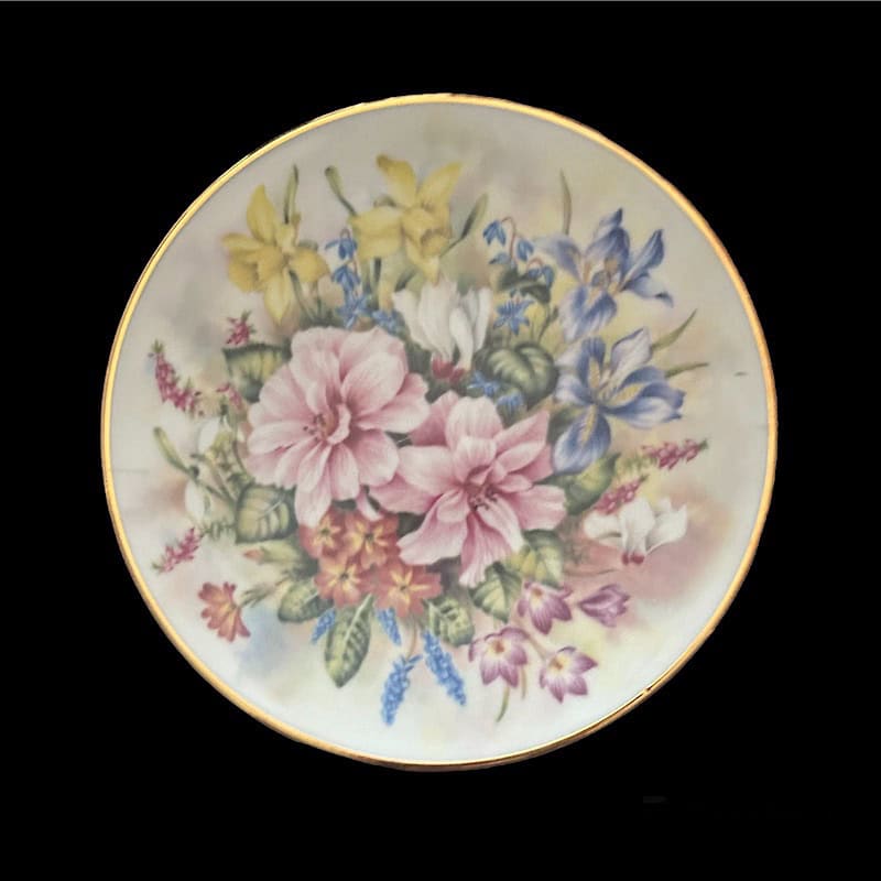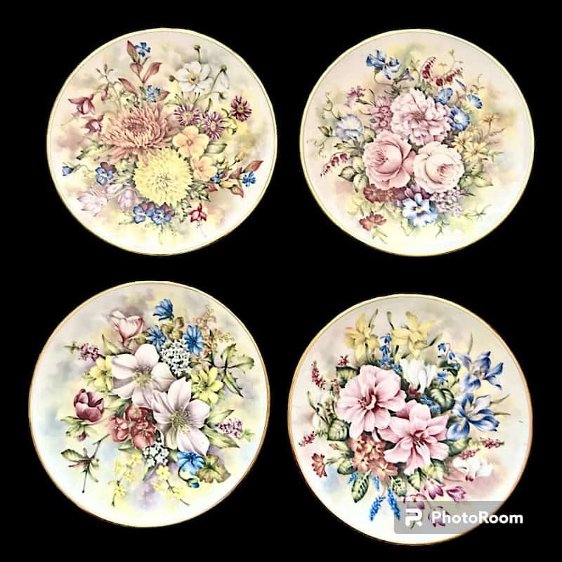 Σετ 4 τμχ. πιάτα τοίχου με απεικόνιση σύνθεση απο λουλούδια σε απαλά χρώματα, σε ανοιχτόχρωμο φόντο. Πλαισιώνονται περιμετρικά με χρυσή ρίγα.
